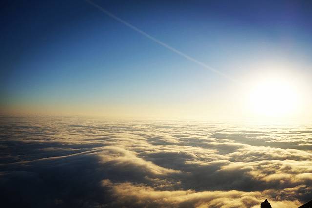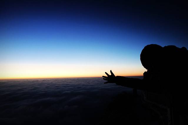 第二天一早起来,出来之后发现漫天繁星啊,好久没有看到这么透彻的星空了,瞬间觉得今天的日出有望了,由于天黑,我们又忘记点手电了,就只有跟着一队人一起登金顶!