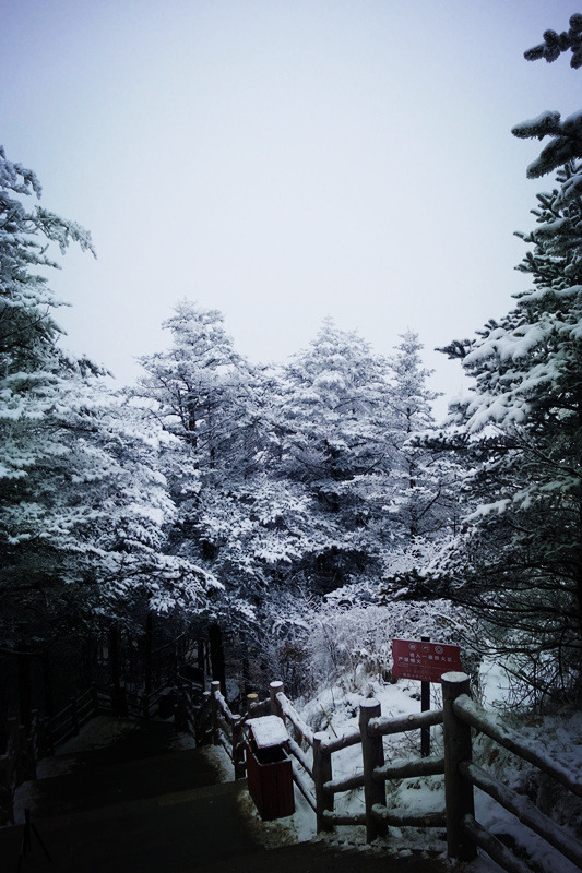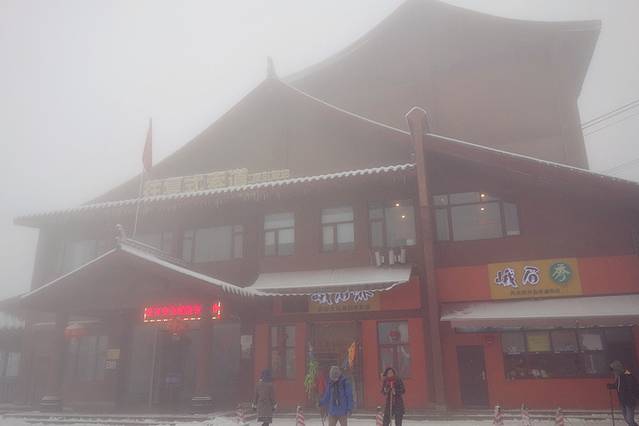 一路爬到万年寺,没有什么特别的景致,颇有点失望,加上时间也快一点了,大家一致决定不再继续爬了,而是到万年寺车站去乘车直接上雷洞坪,从万年寺到万年寺车站大概还要走20度分钟吧!车票40元,途径0公里时会检查门票!一路坐车上来,雪也渐渐的多了,到了雷洞坪已经是白雪的世界了,但是为了赶上上金顶的最后一班缆车,我们也没有闲暇玩耍了,一路直奔索道!所幸是赶上了,这里建议定金顶住宿的朋友一定要把握好时间,一但错过了,就只有徒步6km上金顶,冰天雪地的,想想都后怕!