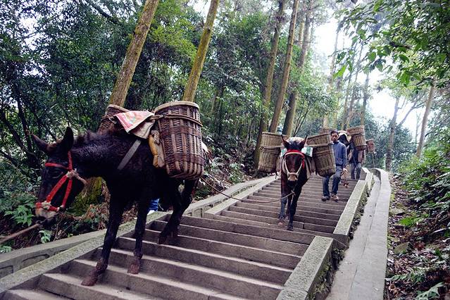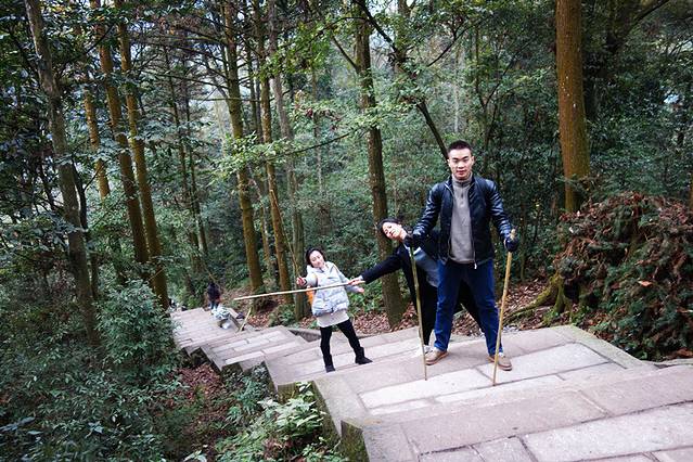 在清音阁这个地方有2个方向可以选择,一个方向是到一线天+生态猴区,一个方向是到万年寺,我们的选择是先去生态猴区,再原路返回去万年寺!友情提醒,可以在山下买一根竹竿一元钱!可以方便爬山和防滑,还能驱赶猴子,但是千万不要去招惹他们,另外还有防滑锁丁,在山下可以买好,5元一副!