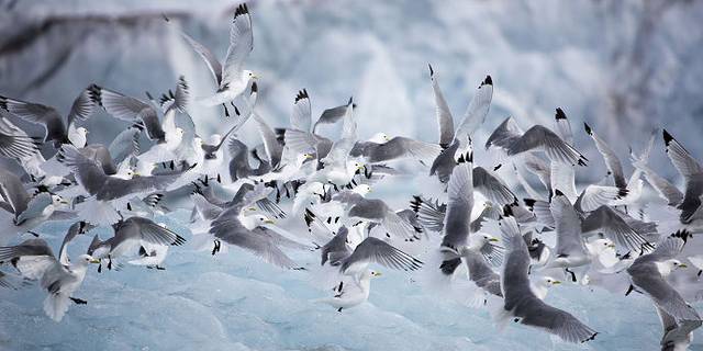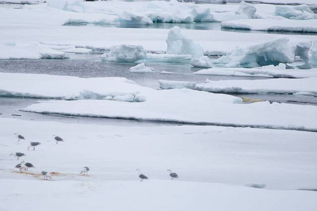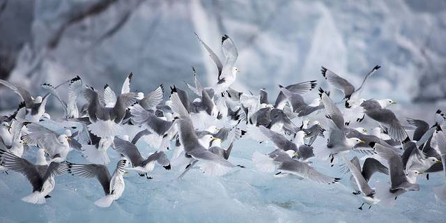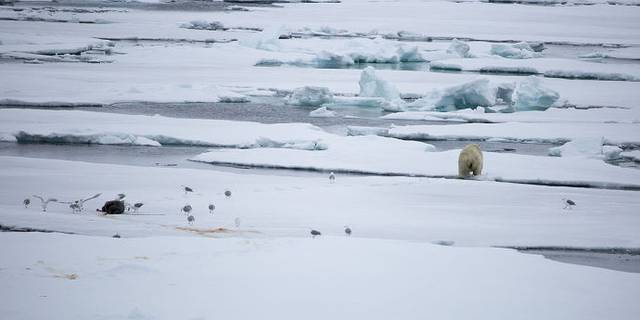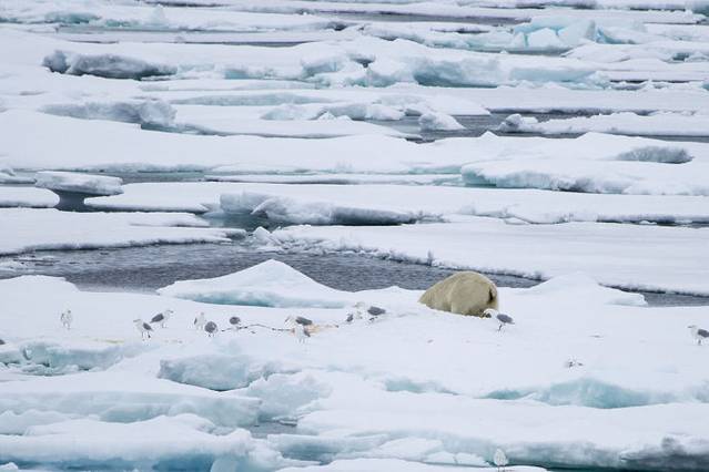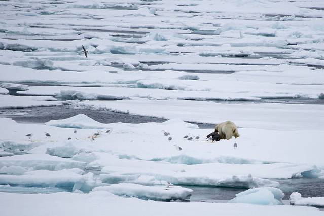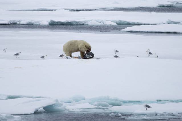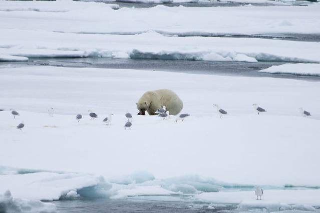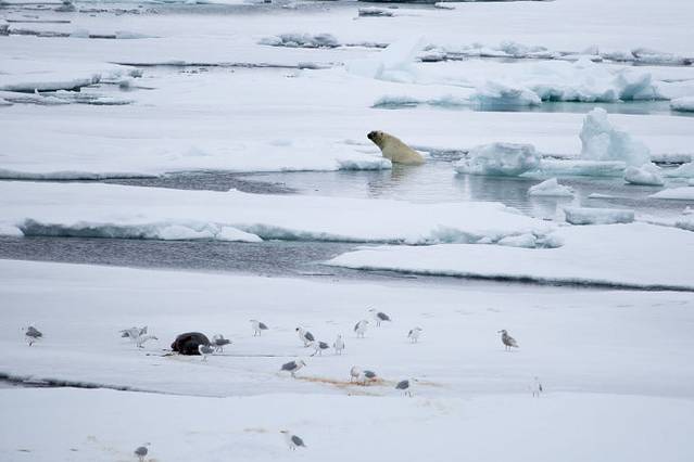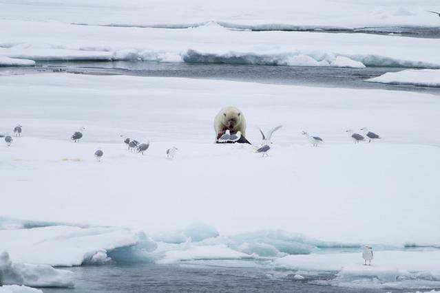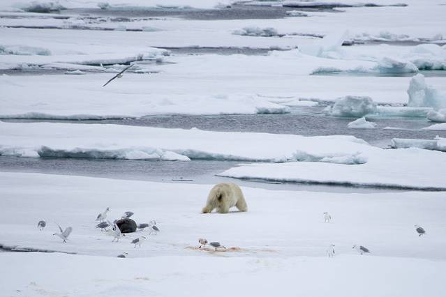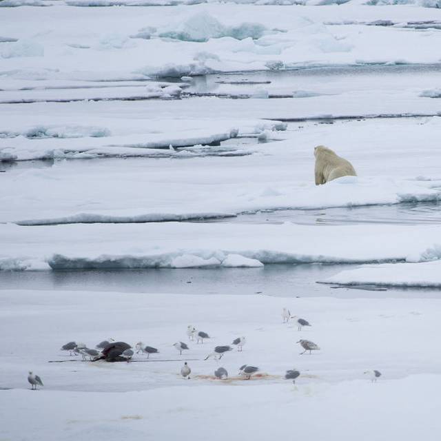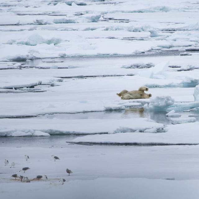 曾看过一组照片,一只消瘦的北极熊试着捕鸟,结果很挫败。食物丰盛时,北极熊对鸟这种小东西看来丝毫不感兴趣,它们更像合作者。