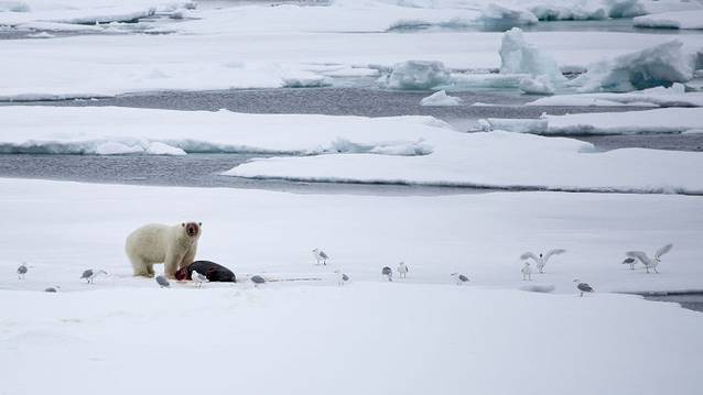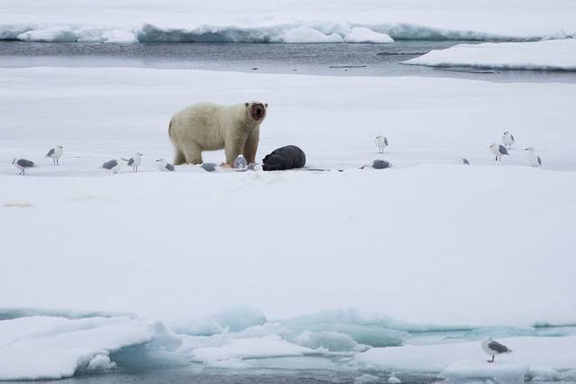船变了下角度,看到了残酷一幕:北极熊正吞食海豹。
