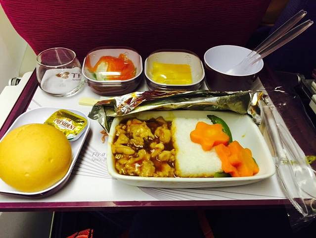 不知道是哪个航空公司,餐食还可以,鸡腿饭发甜,三文鱼沙拉,奶酪蛋糕,小面包没有吃。