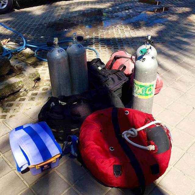 今天就要出海了,只是我和教练两个人潜水 居然要这么多东西,我背上气瓶基本就直不起来腰了…今天是在一个最深也就8米的地方继续做一些练习
