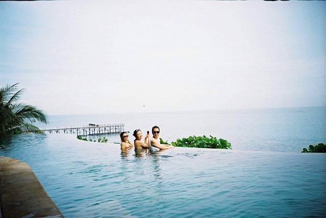 这样的泳池和mbs那个一样,都不是用来游泳的,大家都是趴在边上看风景,以及 照相,我们一共5个人,6个相机,每一次都是看这边,然后看这边,要逐一的冲着大家的相机微笑,也是体验了一把明星的感觉