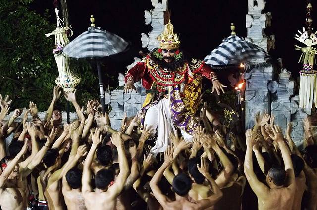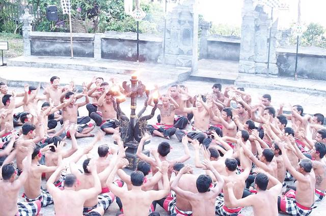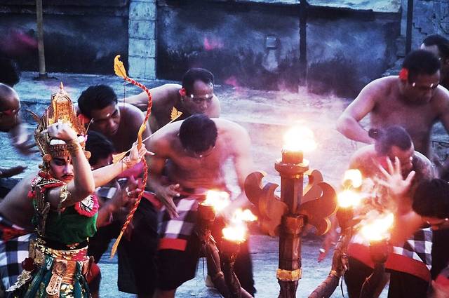 kecak 是一种用来祭神的舞蹈,并没有音乐伴奏,而是由图中的人们针对剧情发出不同节奏的声音,有时是非常快速的重复kecak,有时是长吟,怒吼