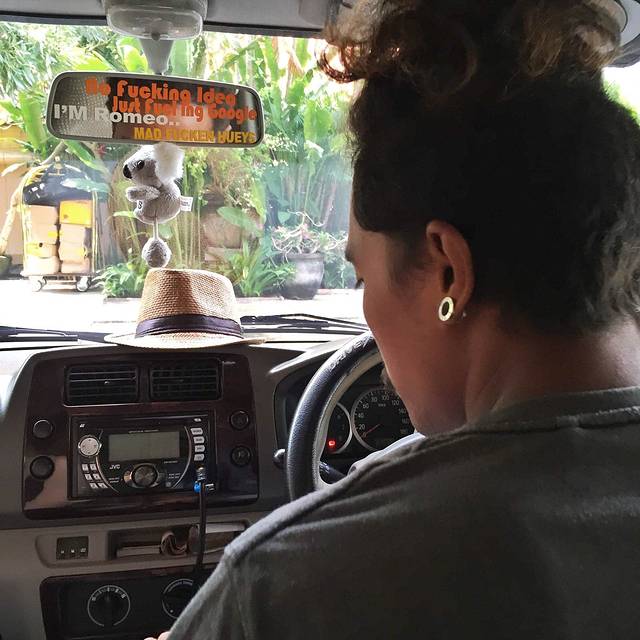 这回拦到的私家车是一个非常炫的小哥的,看到他贴的标语了么,也是炫到不行,一路上各种向坐他旁边的妹子献殷勤 也是让我们笑了好久,可能是在新加坡待久了,忘记这个世界可以是多么大了…本来打算check in之后再翻回来rock bar看落日的,后来得知居然要一个半小时左右的路程…bali岛真的是蛮大的