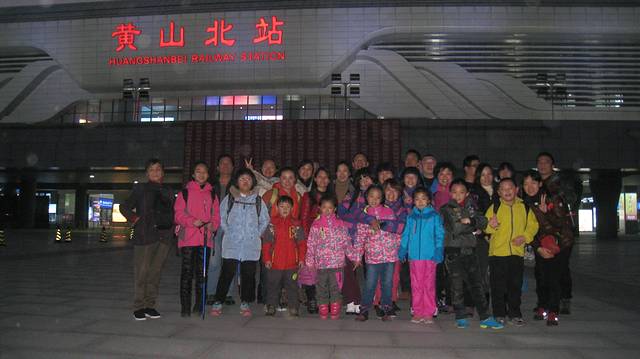 1号下午14:50坐上福州前往黄山的高铁,2个半小时我们准时到达黄山北站,感叹交通便利让出游真是方便很多。导游早在门口等着我们,在站前依然不落俗套的拍了全团照,很可惜,后来才发现每个人的眼睛都是红的,但是四天三晚的行程,只有这张唯一的集体照,还是保留不作删除了。当晚入住完黄山大观--黄山柏丽度假公寓,住的是套房家庭房,这是朋友赞助的酒店,不花钱,这里要感谢他让我们29人度过了美好的跨年夜。入住手续办好后,导游帮我们送到了老街去吃饭。