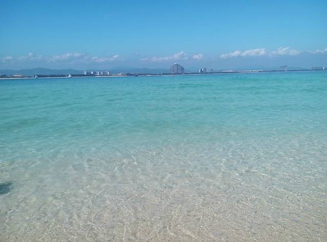 刚一进入蜈支洲岛看到海滩的时候,是有点新奇,但还不是惊艳,可能路途太累了,心情有点浮躁。岛上阳光太刺眼,我都不可以抬头了。唠叨几句,在蜈支洲物价挺高的,建议自带干粮.,在海滨浴场只是踩水没有去游泳的朋友们,建议不要去海滨浴场的冲洗区域冲洗,那里收费,30一个人,对我来说是不可以接受。可以先忍忍,走到后边会有阴凉的休息地和公共冲脚丫子的地方,用勺子舀水淋脚,包你洗的干干净净的。