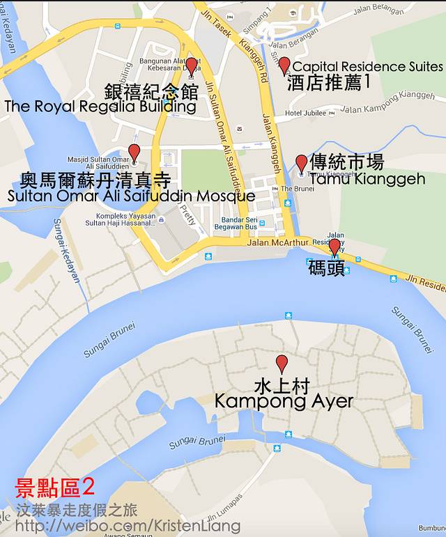 時間緊迫的,也是可以靠著長週末去汶萊3天2夜。下面是斯里巴加湾的地圖,標了我住的兩家酒店、景點區等,給大家參考看需要多少天。景點區基本上就是清真寺、博物館、夜市、商場、市場、坐船看水上人家。