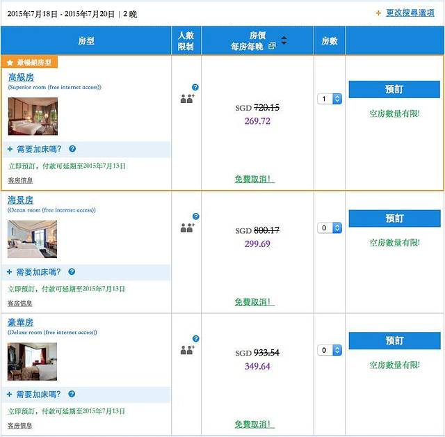 新幣價格(對人民幣4.5),都不包早餐。所以建議在官網訂,包早、還有其他房型、package可以選擇。