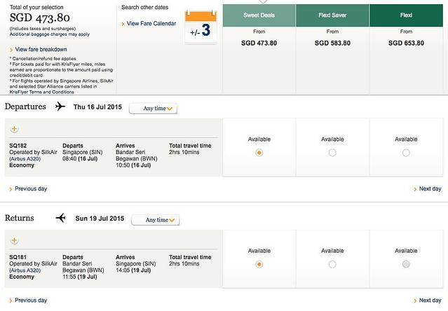 飛行時間2小時10分鐘,新加坡有兩個直飛的航空公司:汶萊皇家航空 Royal Brunei Airlines 和 勝安航空 Silk Air (新加坡航空子公司)。因為是春節期間,票價稍高也是正常,勝安航空$522新幣一個人來回(約2,400人民幣)的票價並沒有翻很多,倒是汶萊皇家航空當時要近1千新幣一個人。以下選了一個長週末(7月17日新加坡公眾假期開齋節)的機票價格,新幣$473一個人來回。