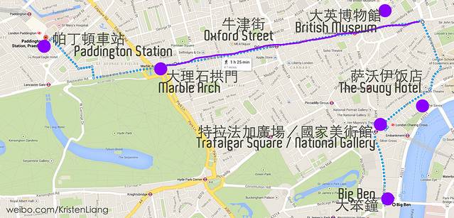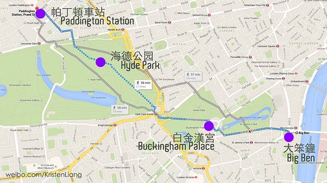 路線1。Google地圖暴走路線 57分鐘(但走走停停肯定能花上半天),比較短的路線是穿過海德公園 Hyde Park,和白金漢宮 Buckingham Palace