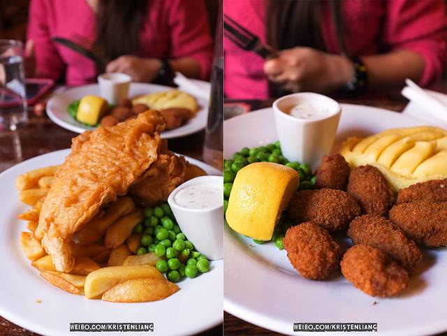 進了廣場附近一家餐廳/酒吧,在倫敦吃的第一頓 Fish & Chips,真的無敵大份吃不完啊!討厭豌豆的我居然覺得超好吃~ 口感不一樣~ 習慣了新加坡餐廳的消費,倫敦也不是特別貴。。。
