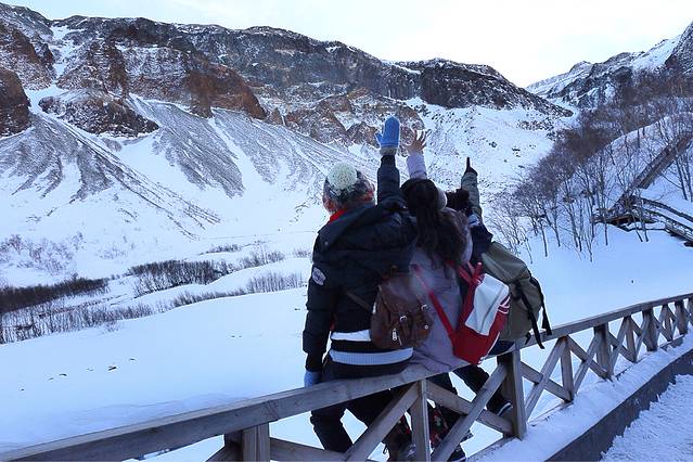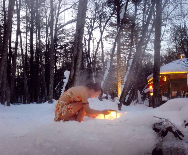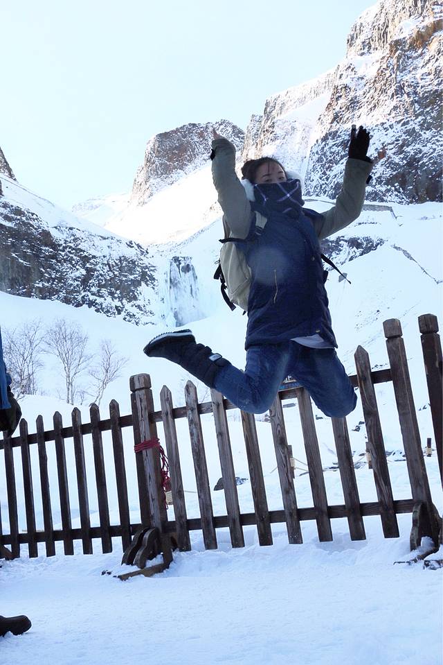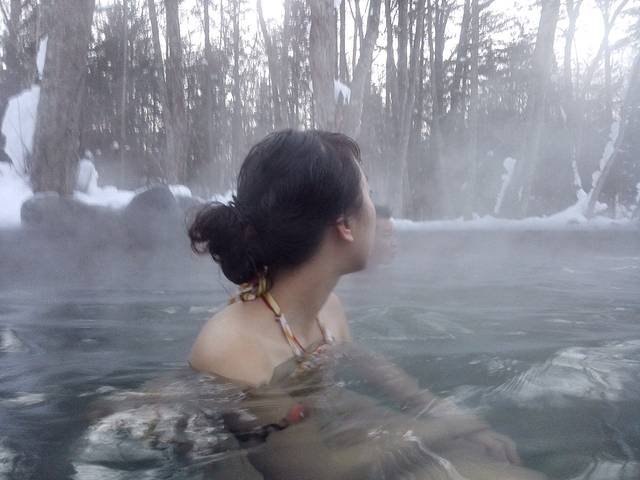 在室外,温泉就在雪地里,热了,就跑到雪地里拍照,冷了,就缩手缩脚回到温泉里,真可谓冰雪两重天哟~