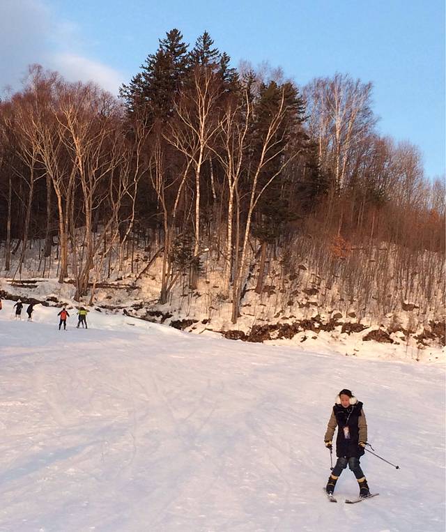 余晖时分,我们滑了近四个小时,也累了…想起来刚换上滑雪鞋,想上厕所,笨拙走到厕所,结果,发现,我蹲不下去…😭