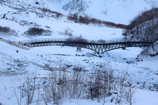 白雪地里镶嵌着这座桥,有种中国山水画的感觉