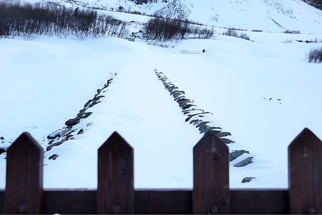打开栏栅,踏入雪地,两边石头依稀可见,雪再厚,也遮不住它们,因为这本是一条路