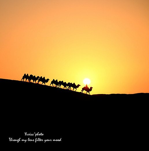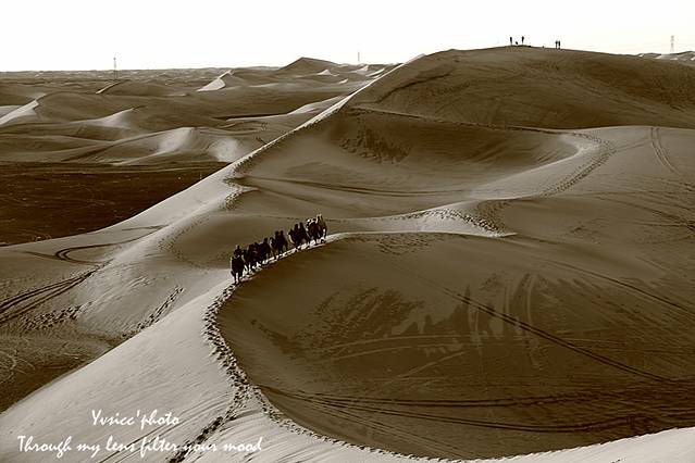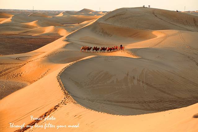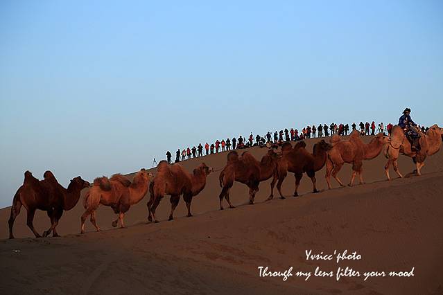 天还是漆黑一片,我们就进入了八道桥巴丹吉林沙漠,去抢占我们的高地,拍大漠日出。(跟着专业人士就是不同,大师们都带着手电呢。)结果发现我们的山头被人霸占,于是我们又在沙漠里艰难地奔向另一个山头。北风呼啸,双手颤抖,打开三脚架,领队发出指示,我们的骆驼队出场。