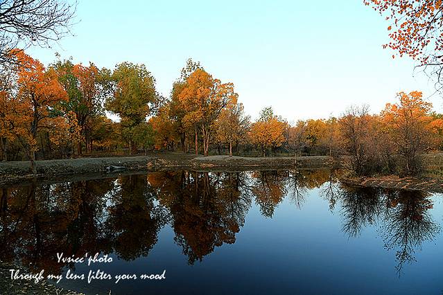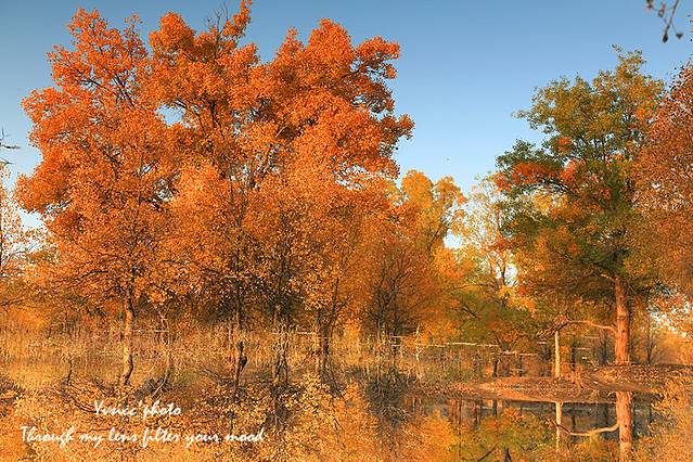 太阳升起,面纱落去, 浓绿,浅黄,杏黄,金黄,金红,层层叠叠,错落有致,色彩缤纷。漫步在胡杨林中,如同仙境般。