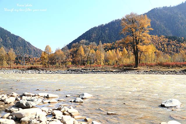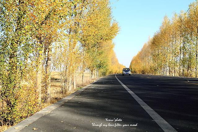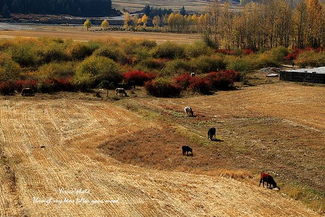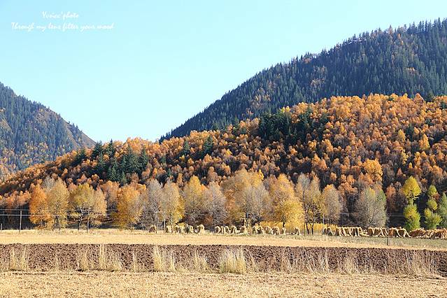 这条线是游侠客新开辟出来的线路,一路上看不到什么游客 ,公路两边一扫前几天戈壁滩景象:绵延不断的山脉,不时有雪山冒出,山脚下草原上悠闲的牛羊,马群,山坡上的森林更是秋色浓郁,还有清澈的河流----,我们车里的游侠们也是情绪高涨,不时哇哇地大叫,可惜很多地方都不能停车,美景没有留在相机里。
