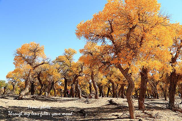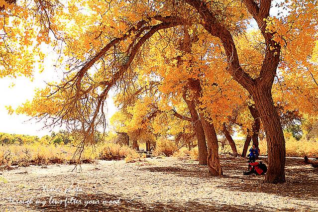因为胡杨树金黄色的周期只有10天左右,又是在国庆黄金周,所以选择跟了摄影游,既然跟的是摄影游,不好再卡片机走天下,临时购置单反,带着说明书上了飞机。