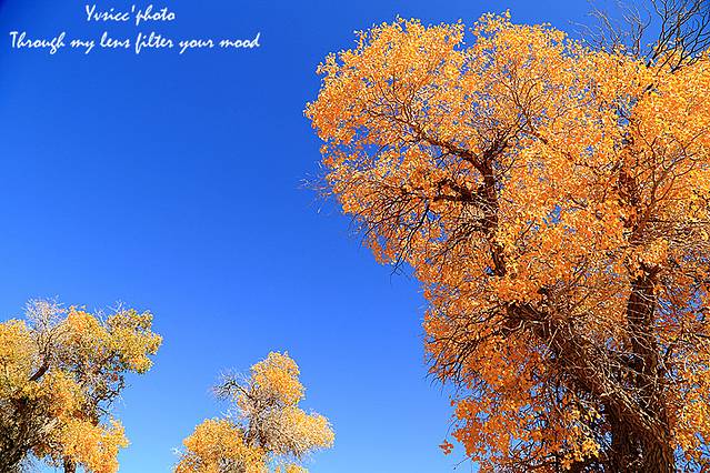 四道桥。 湛蓝的天空下,苍茫的沙漠上,金黄色的胡杨显得更加明媚灿烂。