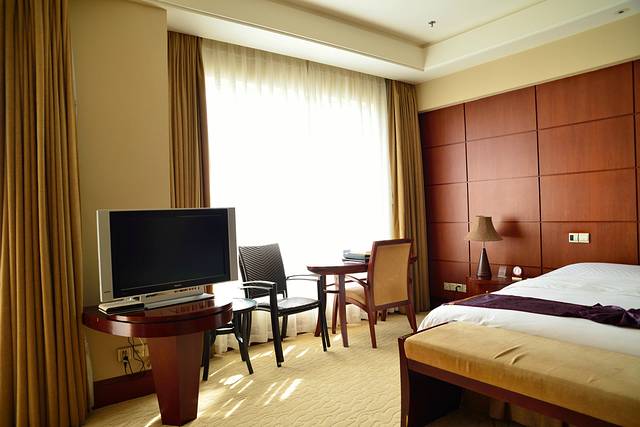 电视也是液晶显示屏幕,看上去与整个房间非常搭配。床的旁边还有一个书桌,方便住店客人办理事务。