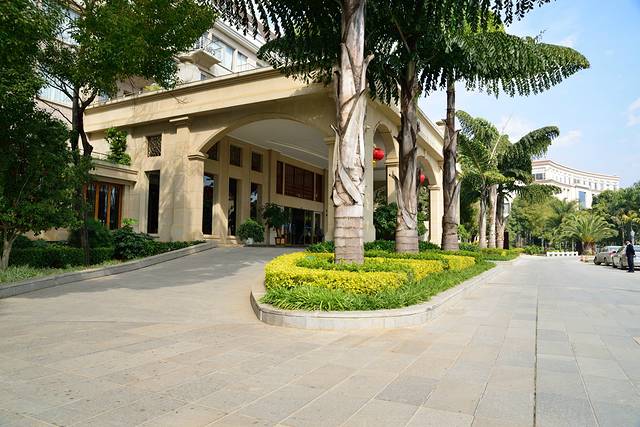 湖泉酒店C座的外观,酒店周围有很多的树,绿化非常好,而且云南的空气很干净,蓝天白云让整个酒店显得更加的静雅。