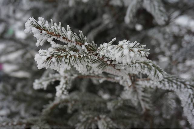 雾凇近景,这其实是谢家客栈的圣诞树,也结了雾凇。同行的一个妹子睫毛太长,睫毛上也都是雾凇了。