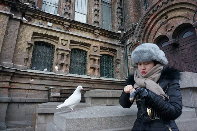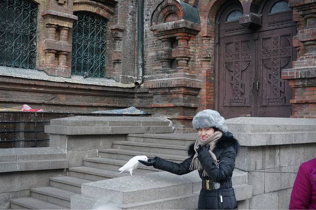 说好的松花江日出,第二天的早晨从十点才开始。赶紧去圣索菲亚大教堂喂鸽子,鸽子被圈在一块,格子吃的玉米三块钱一袋,很小。爸爸回来了鸽子还站在甜馨肩膀上,这会人多到能吸引个鸽子过来吃你手心里的玉米,衣服长枪短炮就咔咔咔。嗯!甜馨人品好,鸽子都喜欢她,么么么!