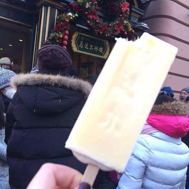 这是五块钱的,全国好多景点都在卖马迭尔,记得北京鼓楼大街还分十来个口味的。不过在零下二十度的气温里吃冰棍还是头一次,还飘着小雪花,吃的是情怀,是哈尔滨,是中央大街。