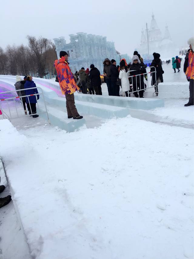 走到了中间的大园子,很多人滑冰,赶紧吃完手里那个花二十块买的冰糖葫芦,上!一个小的滑道,赶紧身先士卒,屁股一坐就下去,看滑道的大哥怪怪的看我,后来在大滑道排队才知道那是个儿童滑道。这是手机随手一拍。美不美?