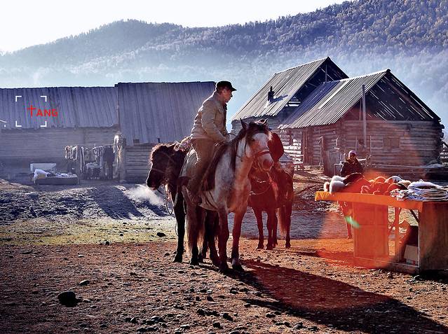 一大早走出蒙古包看到厚厚的积雪才知道前晚冷醒的原因。暖暖的阳光让人恢复了正常的思绪。大家兵分两路到禾木,骑马的负责运送行李,徒步的轻装上阵。我选择了跟随马队,驰骋天地间。