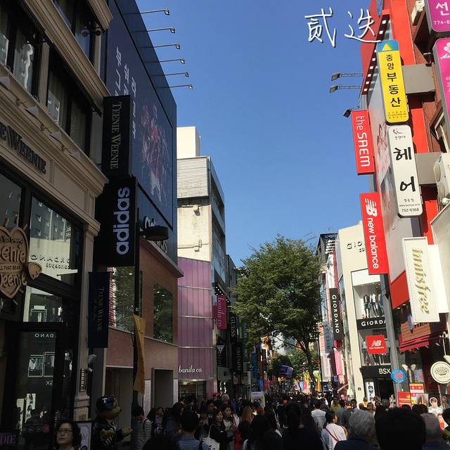 这是白天的明洞,人好多有没有,毕竟放假,好多中国人。看到了吧很多运动品牌店还有当地的化妆品店。