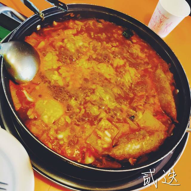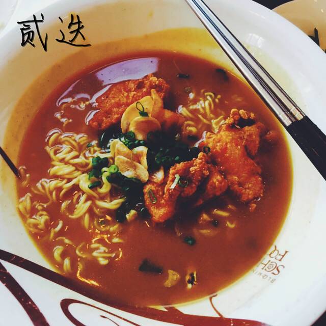 两个人点了三份食物吧,图上这个咖喱猪排拉面,然后还点了一份芝士年糕,还有一份忘记啦,但是都很好吃,两个人吃得也很饱,反正我和小伙伴都觉得这家是我们在首尔吃的可以排位第一,价格的话依旧小贵,毕竟韩国吃的东西普遍就是比国内贵。