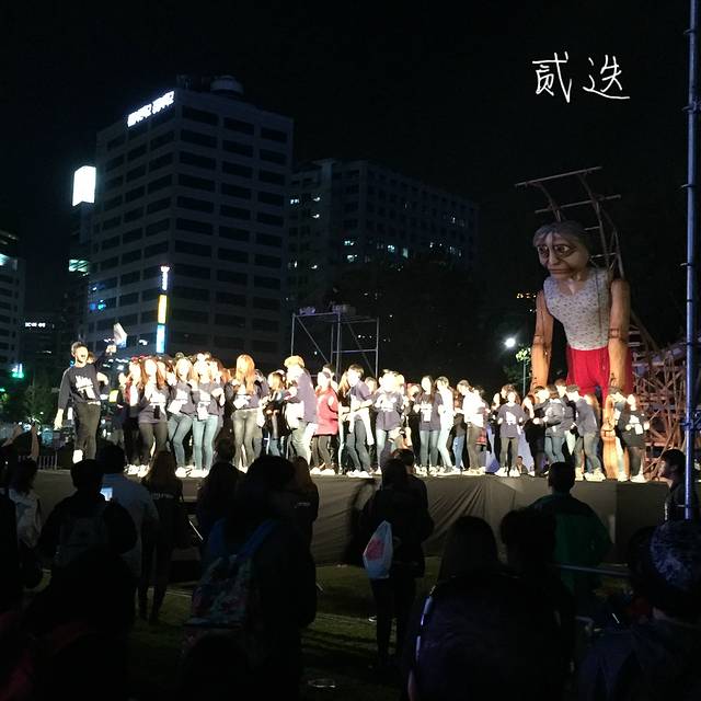 在东大门那偶遇的韩国风俗文化路演木偶戏,和小伙伴学着韩国群众一起席地而坐看了快一小时吧,还有盛大的烟花,我们举着帽子挡在头顶,烟花都会掉在我们身上,又好看又要担心会不会烧到……这个意外遇到的演出很将人带入本地生活的感觉。照片是已经结束的时候大家都站起来了,演员们都上台谢幕跳舞。