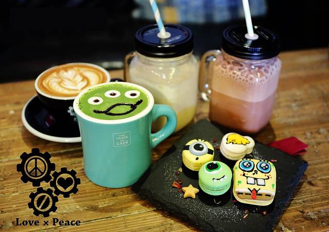 位于逢甲巷弄裡的Love . x .Peace Café,一踏进店内,迎接的便是罪恶的甜点冰柜,店内最着名一直受到大家讨论的迪士尼造型马卡龙,各种不同的卡通人物,手工非常的细腻,搭配不同的节庆也会为已经萌到不行的造型马卡龙再多加点缀,除了马卡龙有造型外,饮品方面人气商品的抹茶拿铁,也会有大眼怪跟三眼怪的拉花造型喔,种种可爱又萌到不行的商品,从踏进店内的第一秒就疗癒、融化你的心。