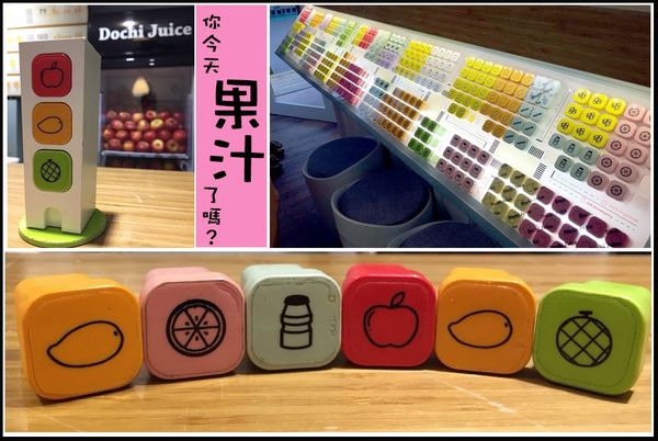 都奇果汁强调是不加水不加糖的100%纯天然果汁,一天限量300杯的品质控管,保证让客人喝到的每一口都是最新鲜的营养果汁。不只果汁新鲜就连点餐方式也非常特别,像是很多积木一条一的插展示柜上,每个积木都有不同颜色和图案,代表的是不同的水果、蔬菜还有一些小食材等等,像是柠檬、芒果、西瓜、杨桃...,红萝卜、南瓜、石莲花...,配料的话有像是布丁、牛奶、养乐多...等等的配料,当然这麽多选择。