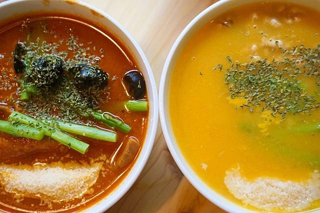 店内汤品有十二种,可是每天有供应的大概只有六种到七种,菜单每天都会更新,所以运气好当天来会刚好遇到自己最喜欢的汤品,也或者可以尝试新的口味。餐点有分单点及套餐,点套餐会有两碗小碗的汤再加上蔬菜炊饭或麵包择一,口味选择多一点,饱足感也较多,每日不同风味的蔬菜炊饭,只加一点点的盐调味,拿来搭配浓郁口味的汤品刚刚好,有机会不妨来喝碗汤吧,体验不一样的家温度。