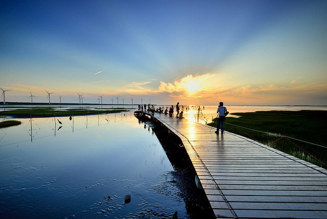 其实不管到哪旅行,除了体验当地的都市节奏,也一定要多看看当地自然风景,在台中清水区的溼地生态风景区高美湿地,面积共1,500公顷,拥有丰富的天然资源,是国内少数几处雁鸭集体繁殖区之一,夕阳日落的感动也可以在这裡欣赏的到喔,高美湿地虽然面积不大,但是由于泥质及沙质滩地兼具,加上与河口沼泽地带镶嵌在一起,所以孕育了丰富又复杂的湿地生态,如果想要更了解高美湿地的自然生态环境,当地管理处也有提供导览服务,木栈道的尽头是湿地比较外围地区,在退潮时可以下到湿地开放区域玩水,所以前往高美湿地前,也先建议看一下涨退潮时间。