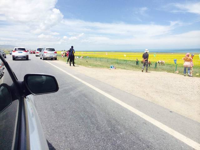 这个是出西宁市区,准备上青海湖的高速,人多车多!