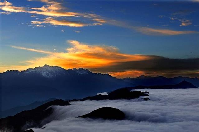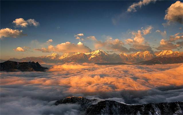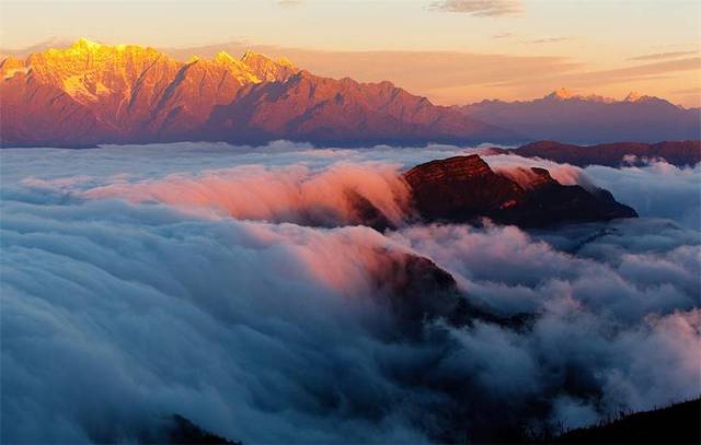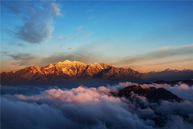 6、日照金山:日出日落之间,落日的余晖洋洋洒洒的落在雪上上,影印出绚烂的金色,很是壮观。特别是那蜀山之王贡嘎雪山!