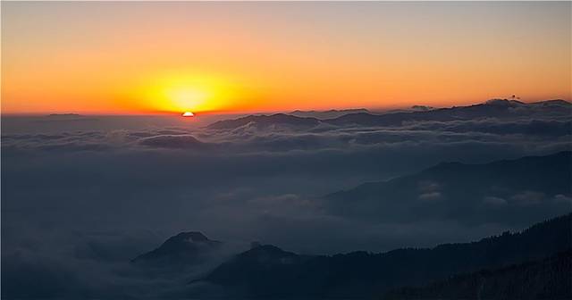 5、夕阳:随着天色渐渐变暗,太阳慢慢西沉,天边也变成血红色,夕阳把这片翻滚的云海渲染得更加灿烂,没想到高原的黄昏竟是如此绚丽多彩。透过镜头看眼前的云海,夕阳给这片金色的海洋增添了更多的绚烂和辉煌,那些随着翻滚的云海起伏的山峦更是为这片美景增添了几分神韵。
