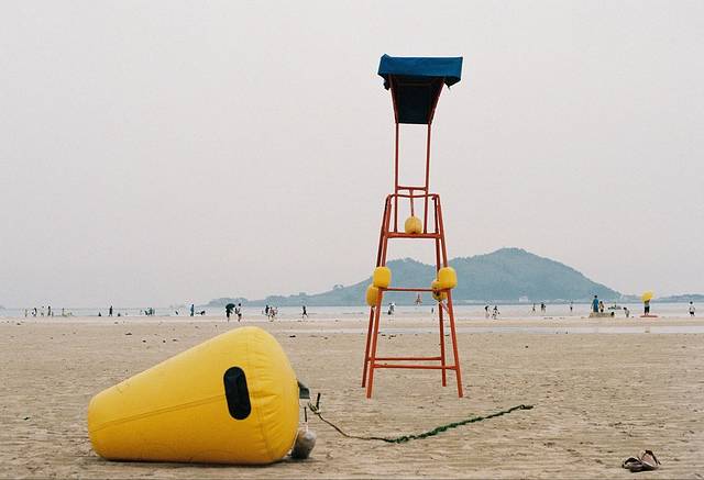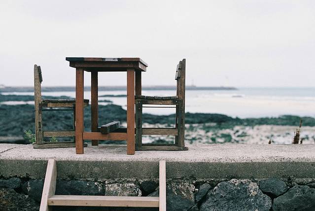 细花里海滩,济州岛的不少海滩边都会放着这样的小椅子小桌子