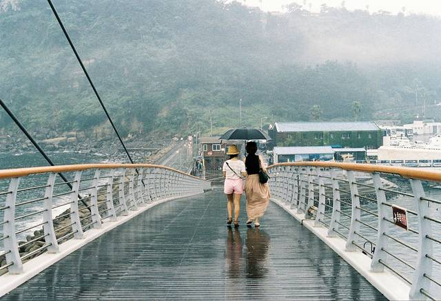 新缘桥连接西归浦岛和鸟岛,造型源自济州岛上的传统木筏