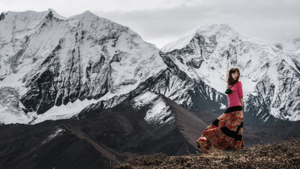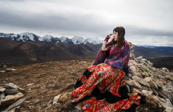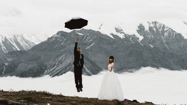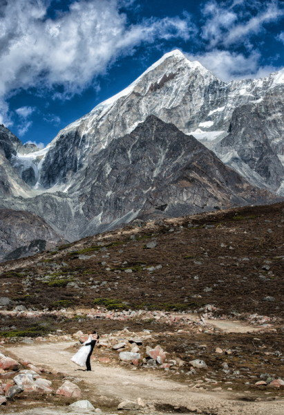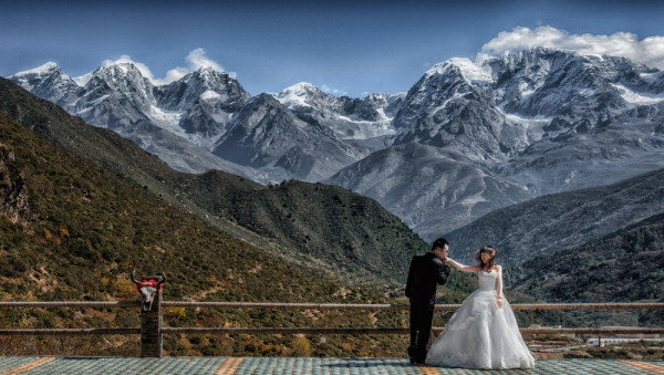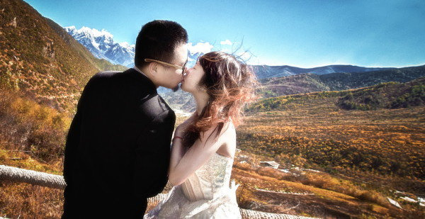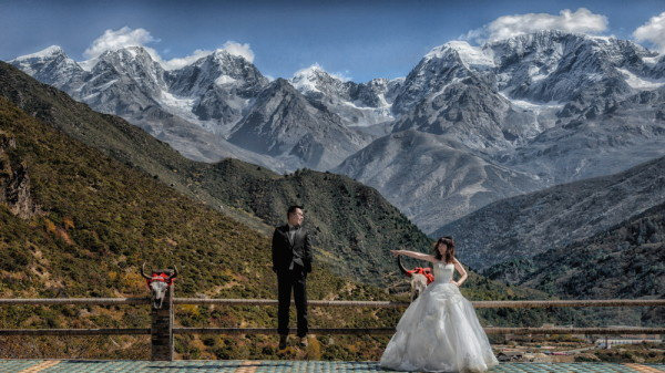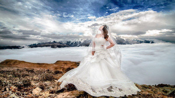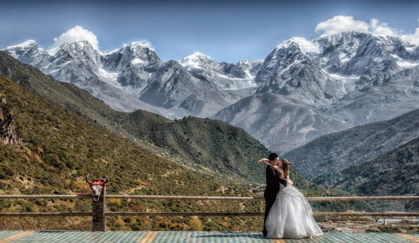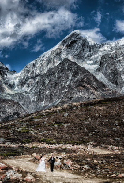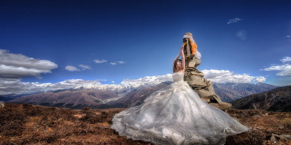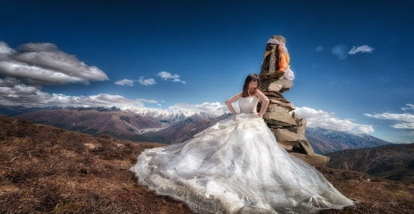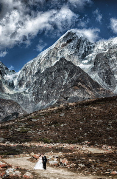 穿上婚纱下车的一瞬间,冷字怎么写已经不知道了,看着穿着羽绒服冲锋裤的各位甲乙丙丁,眼泪也被生生的冻了回去。在4500米的风雪交加中,我和吴先森成为了长枪大炮的焦点。(害羞)(害羞)(害羞)
