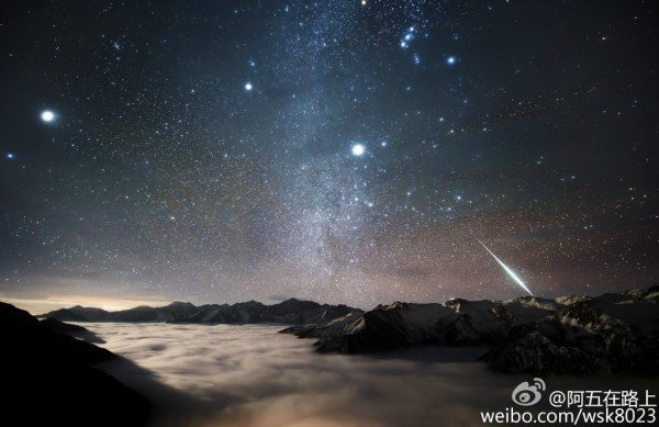 2014年12月14日,双子座流星雨,吴先森在巴郎山熊猫王国之巅拍摄到云海火流星,成为NASA每日一图第十位中国籍摄影师,他说,这是川西送给他的最好新年礼物~~~~