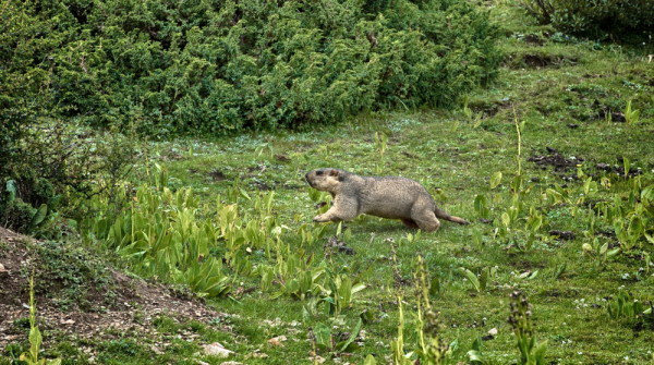 从雅哈去往子梅的路还蛮好走的,下山路毫不费力,重点是能在路两边的草甸子上发现大惊喜!!!——肥硕的雪猪子——旱獭!!!发现这个萌物的时候不要尖叫不要兴奋,一定要轻手轻脚匍匐前进用长焦扫描,不要妄想能有多接近它,鬼机灵的他们一闻到风吹草动就会马上钻回巢穴里去,再无踪影。