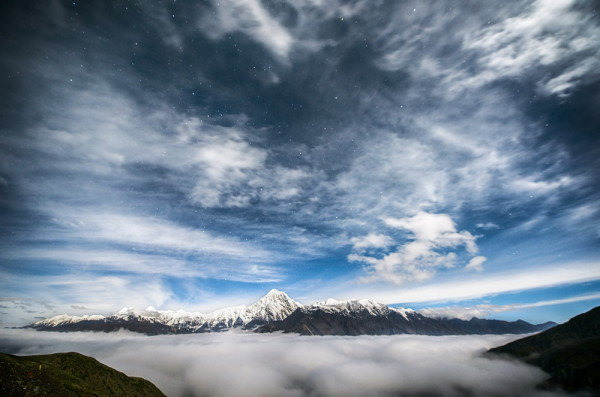 18:00左右,继续上路经过甲根坝近一个小时的烂路抵达了雅哈客栈,和主人预定了晚饭及房间,又马不停蹄地继续往垭口开。吴先森神神秘秘地表示雅哈垭口会有一个惊喜给我,就再也不肯多说。抬头望天,已经是繁星点点,在黑黢黢的山路上小心翼翼地行驶了40多分钟,最后一个转弯,一群黑黝黝的山脉跃入眼帘,吴先森面带得色的告诉我这就是贡嘎雪山,如果是白天看到一定会被震撼到(这个感觉在第二天的白天就真实感受到了)。