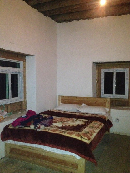 房间很破旧,除了一张床四周空荡荡,门也是不能锁住的,电灯过了23:00电压陡降昏暗得有一拼,主人说他正在修一幢新的客栈,明年5月我们再来就会有含厕所的标间,这幢客栈会花费他40万,从山外拉一车建筑材料进来就要8400元,我听得直咋舌。